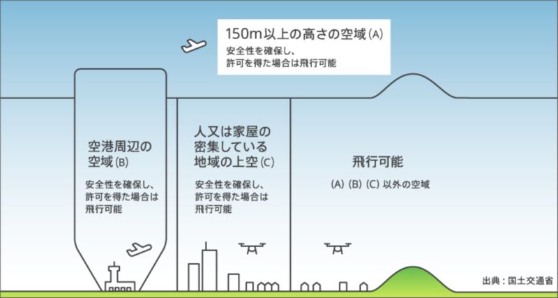 制限エリア:人又は家屋の密集している地域の上空、空港の進入表面等の上空の空域、地表又は水面から150m以上の高さの空域