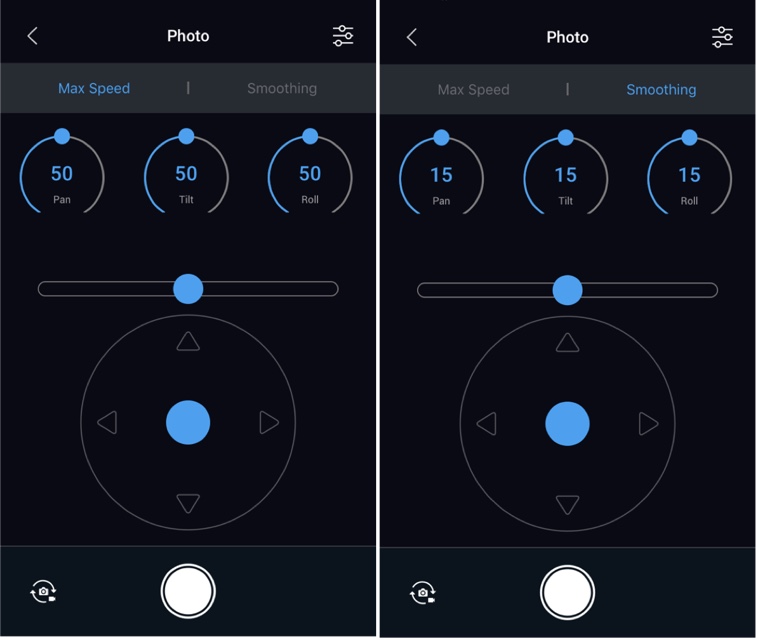 Photoモードでは、「Max Speed」と記載されているジンバルコントロールの最大スピードの設定と、「Smoothing」と記載されるジンバルコントロールのブレーキスピードの設定が可能です。