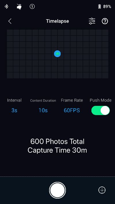 Timelapse モードには、「Interval」(シャッター間隔時間) 、「Content Duration」(動画時間)、「Flame Rate」(撮影枚数)、「Push Mode」(ジンバル手動調整モード)の項目があります。