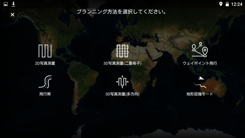 ファームウェアの更新が完了すると、下のキャプチャ画像の通り、飛行プラン画面に「3D写真測量(多方向)」と「地形認識モード」のアイコンが追加されます。