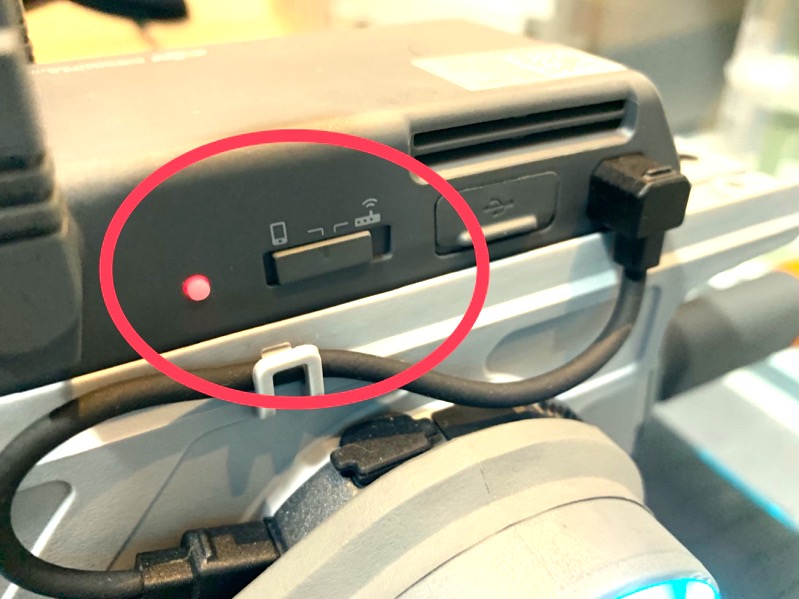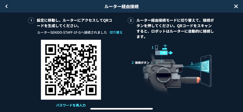 ブラスター側面の接続スイッチをルーター側に切り替えて、スイッチ横の赤く光る接続ボタンを押し、QRコードを機体のカメラで読み込ませます。