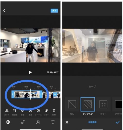 そちらを押せばカットとカットの間に特殊効果を入れる事ができ、誰でもプロっぽい映像を作れます。