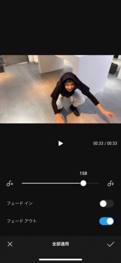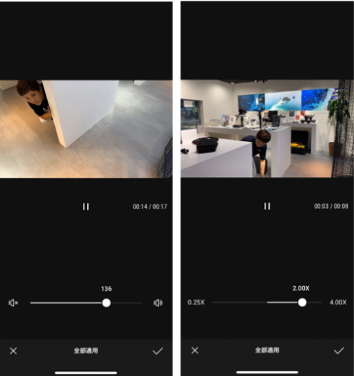 映像の順番、再生時間や色調を整えたら、次に音量バランスと再生スピードも調整します。