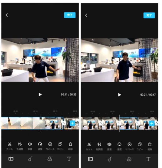 画面左下の「カット」をタッチすると1つの動画を任意の位置で2つに分割できます。