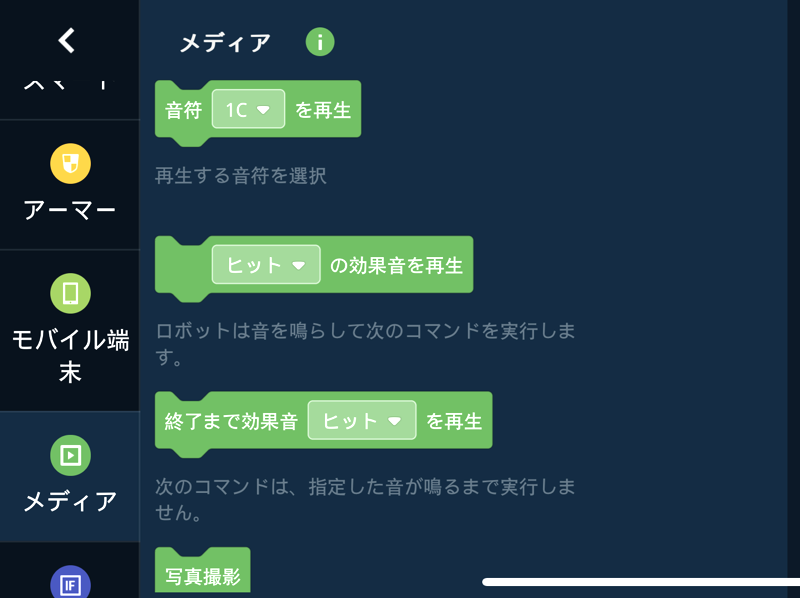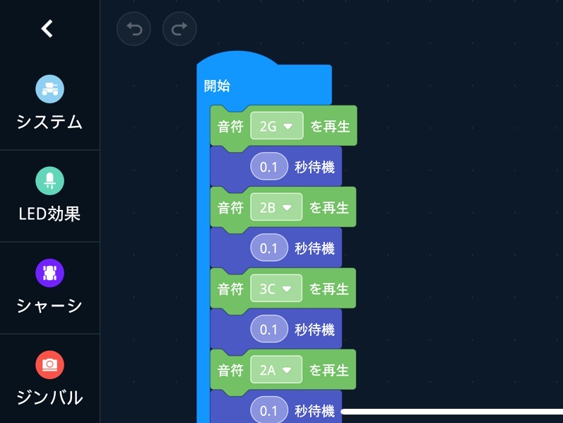 ROBOMASTERに演奏をさせるには、音色と音色の間に0.1秒間待機などのコマンドを入れるなどして、音を1つずつ鳴らす必要があります。
