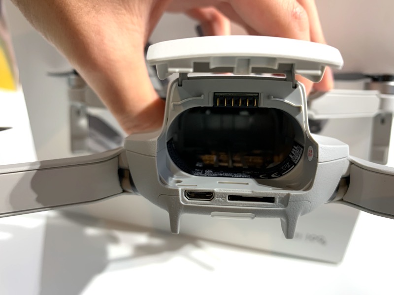 Mavic Mini には障害物センサーが搭載されていますので、機体表面はツルツル。機体後部には、microSDカードスロットと充電用の端子が備えられています。