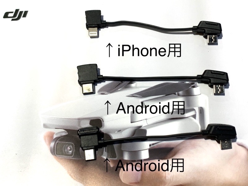 飛行をお楽しみ頂くには、同梱の送信機(コントローラー)にスマートフォンなどを接続する必要があります。その際は、付属する3種類のケーブルからお持ちのスマートフォンに対応したケーブルを使用してください。