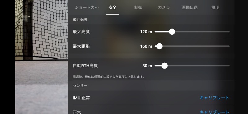 DJI製ドローンには、予め機体の飛行限界範囲を設定しておける便利機能が存在します。もちろん Mavic Mini にも搭載されており、アプリ設定画面の「安全」という項目から「最大高度」「最大距離」という形で指定できます。