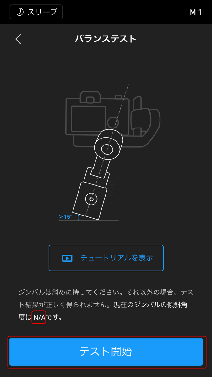 傾けると傾斜角が「N/A」から「角度」に変わりますので「15度」より大きく軸を傾けて保持して、「テスト開始」を押してください。