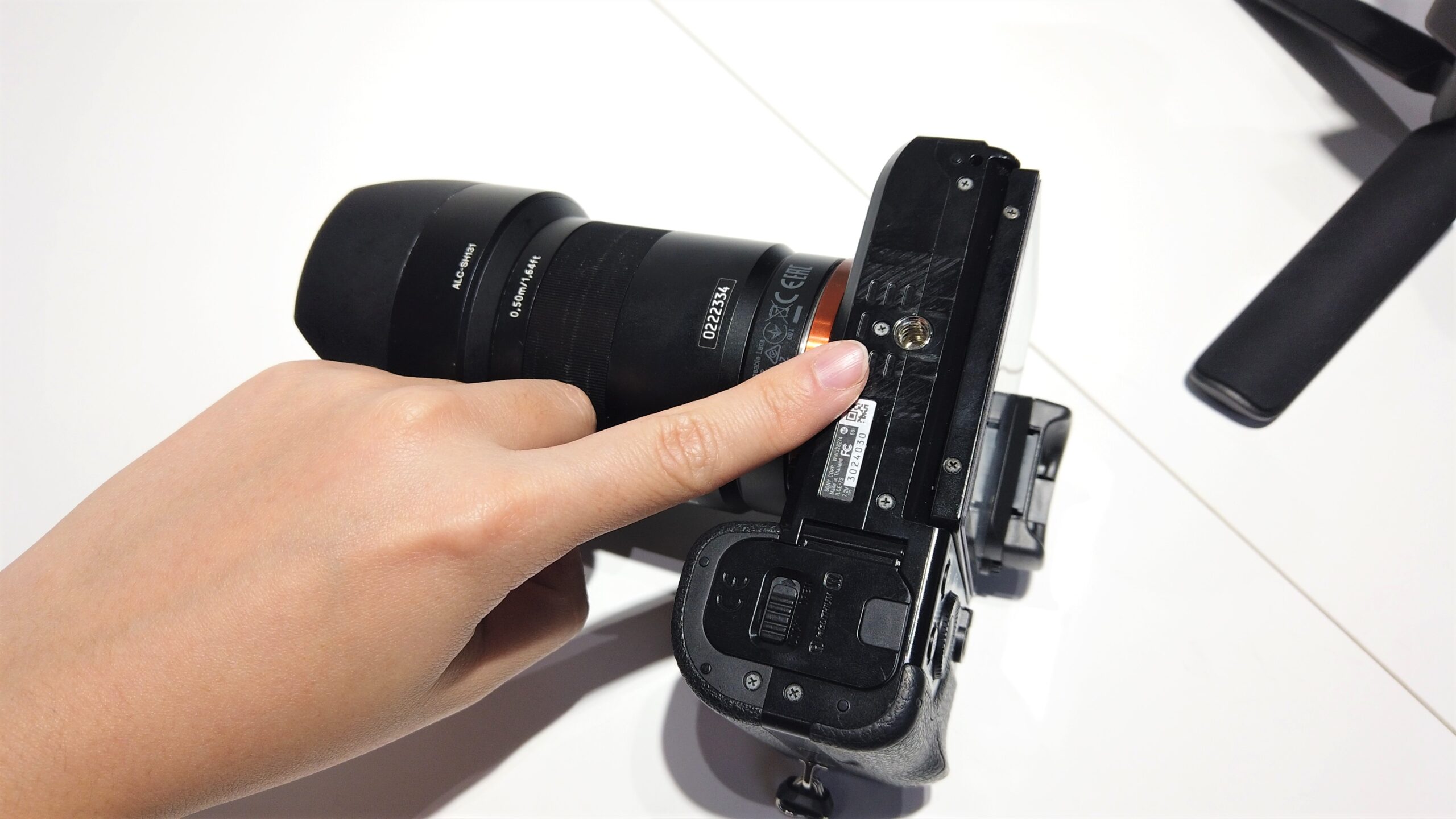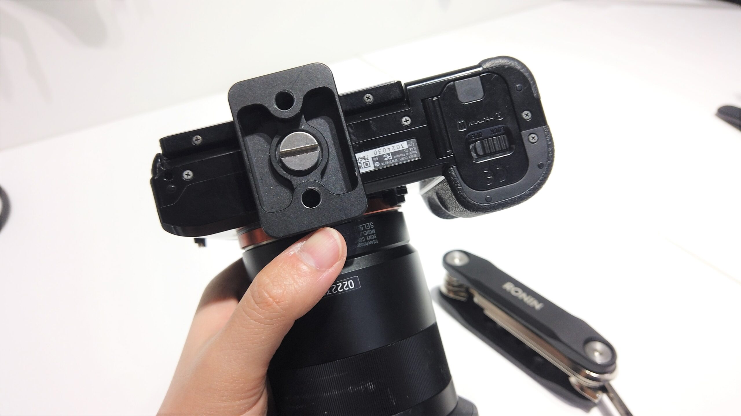 次に、Ronin-SC 本体のカメラマウントプレート底部にあるノブを緩め、カメラをプレートにスライドさせて取り付けます。