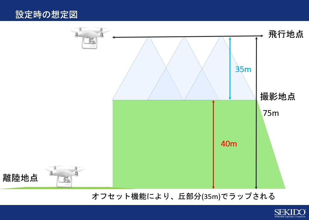 オフセット機能とは、自動航行の際のドローンの相対高度を調整して、撮影時のラップ率を補正する機能です。