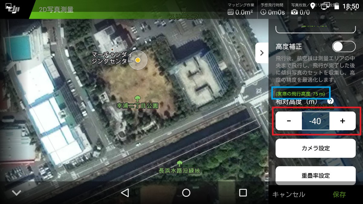 撮影予定地点の高度を基準として考えるため、今回の場合では画像のように相対高度に「-40」を入力します。