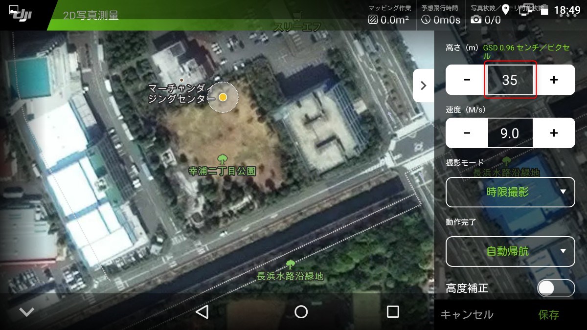 オフセット機能で相対高度を設定すると、通常の高さ設定は下の画像の通り「35m」となっており、撮影地点からの撮影高度を示しています。