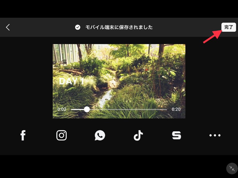 カットごとの再生部分を調整したら、①の赤い矢印が示すボタンをタップして、動画の生成が開始されますので暫し待ちます。