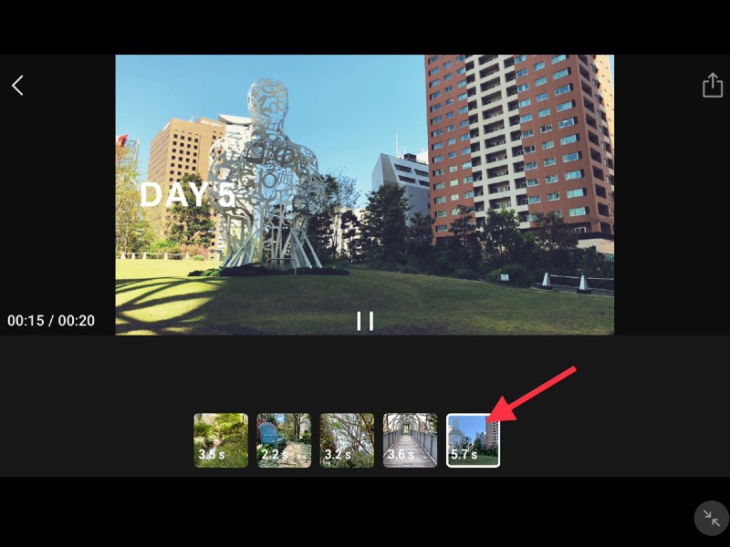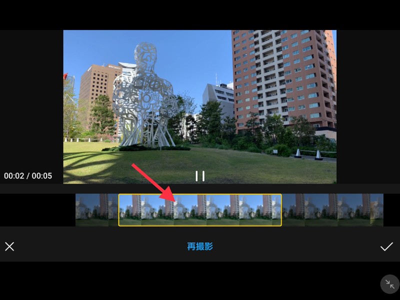 その場合は、まず赤い矢印で示しているように、修正したい部分の動画をタップします。