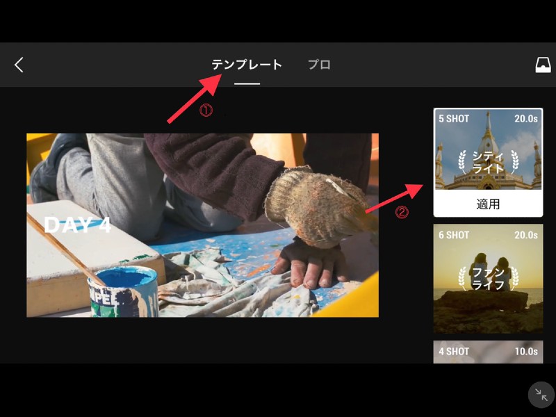画面上部の[テンプレート]をタップし、お好みの「映像パターン」を選択します。