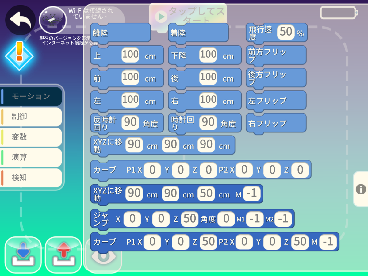 上記のブロックを組み合わせることで、あらゆる操作をプログラミングすることができます。思い通りのフライトができるように、いろいろな組み合わせを試してみてください。