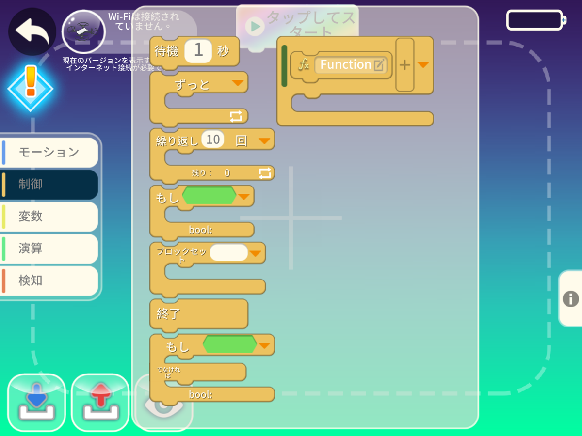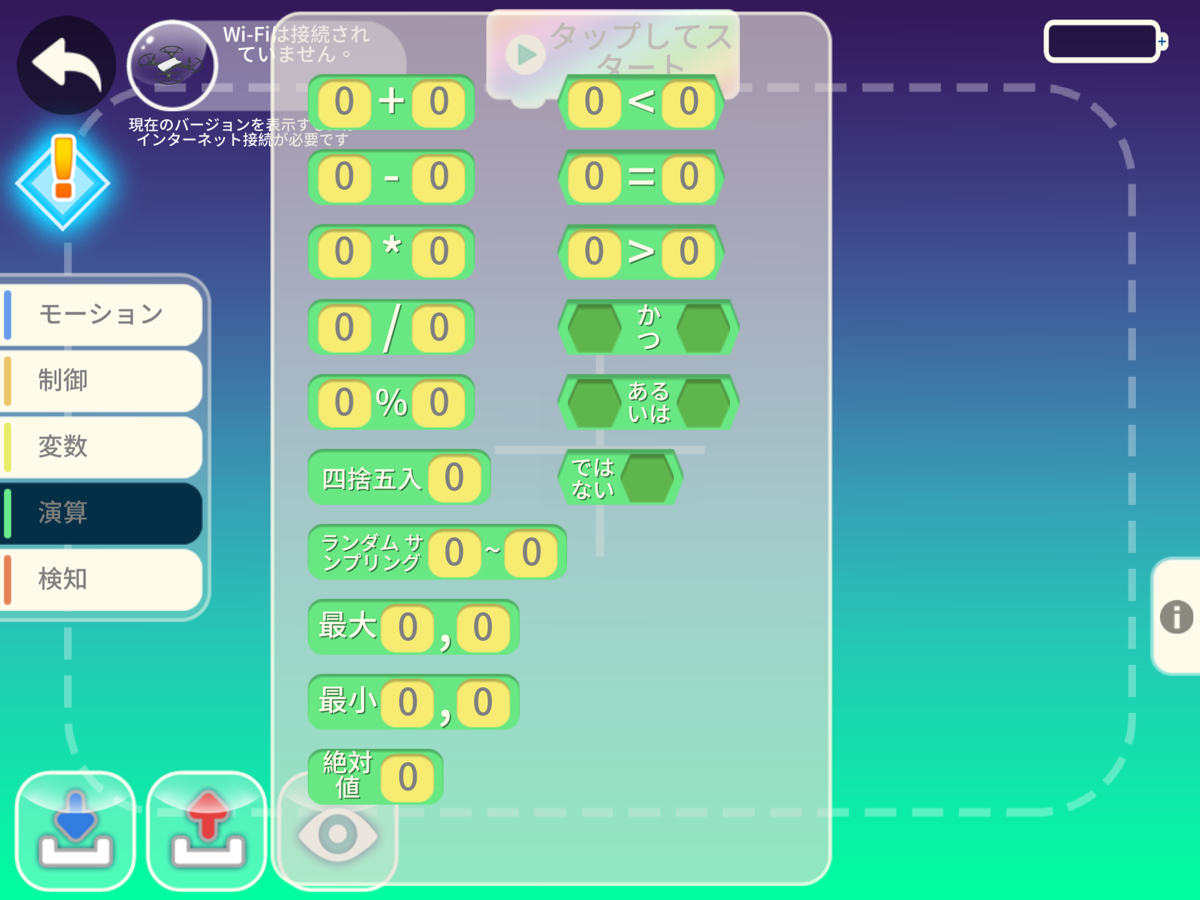 ブロックの画面で、ドローンのアイコンが緑になっていれば接続成功です。周囲に注意しながら[タップしてスタート]ボタンを押してください。