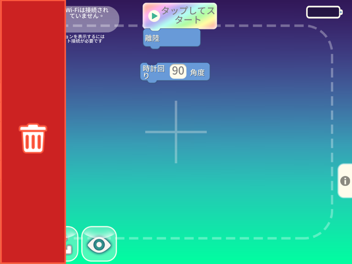 実際の Tello でプログラムを試す前に、アプリ内で「目玉のアイコン」を押すことでシミュレーションを見ることができます。目玉のアイコンを押した後、[タップしてスタート]のボタンを押してみましょう。