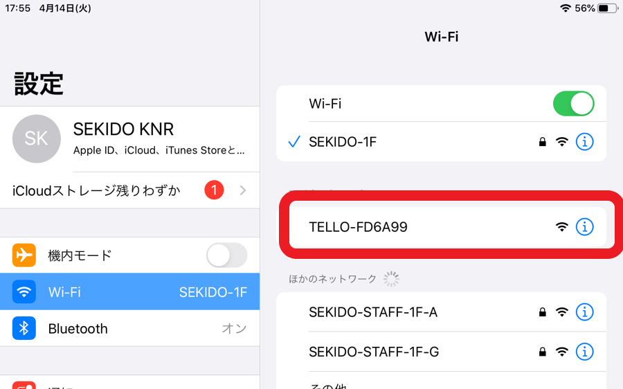 Tello から Wi-Fi ネットワークが出ていますので、お使いのスマートフォン・タブレット端末からで接続してください。