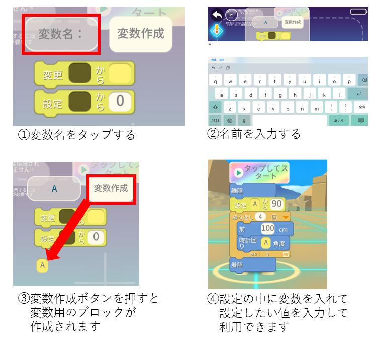 ・ヒント:変数の作り方(下の例では4角形で飛行します)
