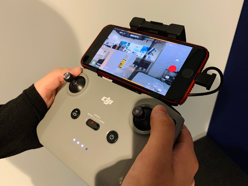 (オフィス3階から1階のストアに展示した Mavic Air 2 のジンバル操作を検証中 )