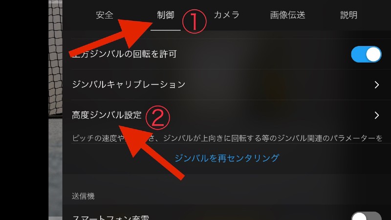 ・「制御」の項目から「高度ジンバル設定」をタップ