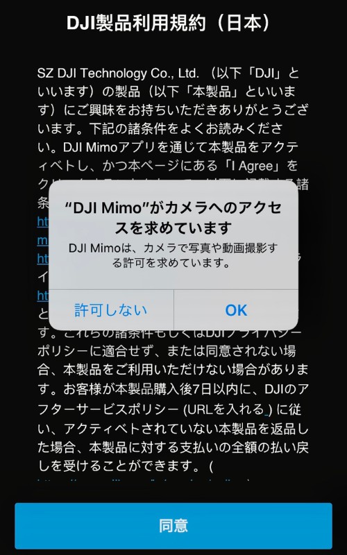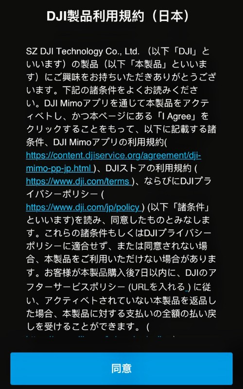 続いて、DJI製品に関する利用規約が表示されますのでご一読いただいた後に「同意」をタップしてください。