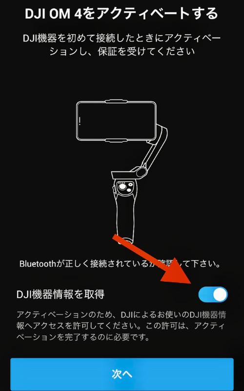 赤い矢印の「DJI機器情報を取得」をタップして「ON」にして、画面下側の「次へ」をタップしてください。