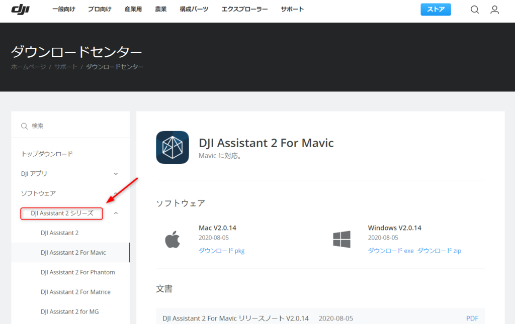 DJI ダウンロードセンター の左のメニューから「ソフトウェア」-「DJI Assistant 2 シリーズ」を選択して、お持ちのドローンに対応したバージョンを選んでください。