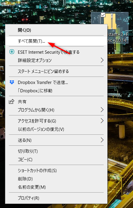 ダウンロードフォルダを開いたら、ファイルを右クリック ー 「すべて展開」をクリックするとファイルの解凍作業が始まります。