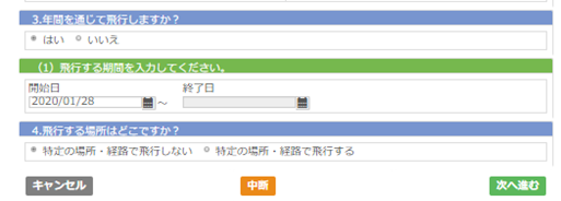 飛行申請は全4ページですので、ここまでで入力は半分終わりました。