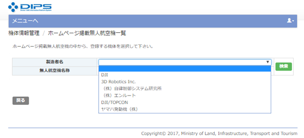 「製造者名」「無人航空機名称」という項目から、ドローンメーカーを一覧から選択し、