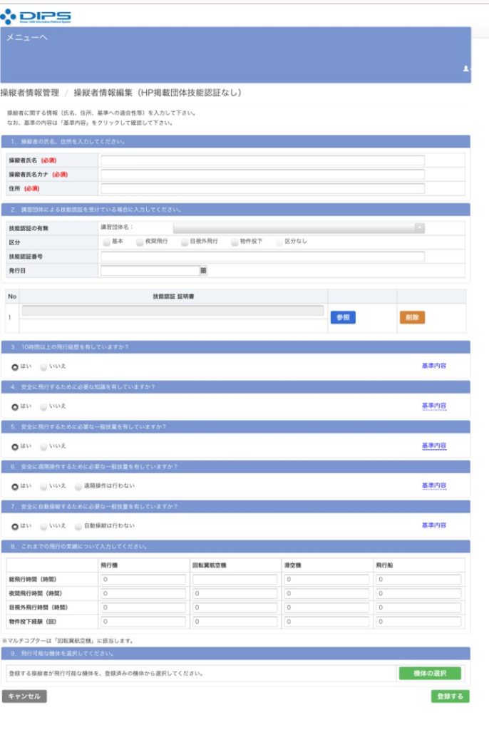 メニュー画面から「操縦者情報の登録・変更」を選択すると、個人情報と必要事項記入の画面になります。