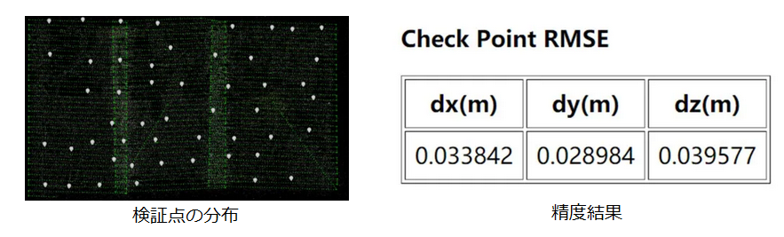 精度結果として、「x,y座標」の誤差は4.47cm、「z座標」の誤差は3.96cmであり、地形測量とマッピングの精度要件を満たす結果となりました。検証点は約50点使用しております。