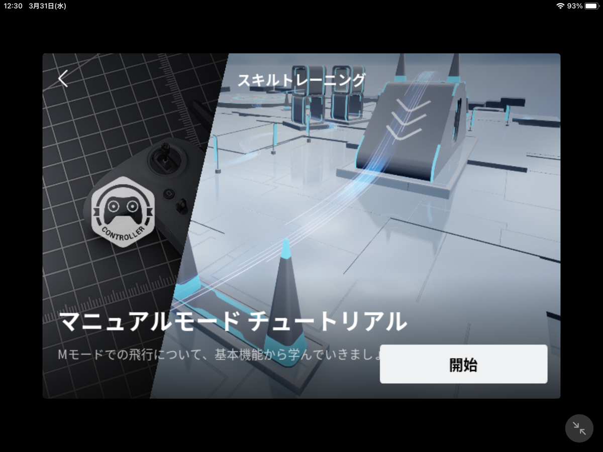 「スキルトレーニング」では、アクロバット飛行に欠かせないMモード(マニュアルモード)の練習ができます。Mモードでの操作になるため、スキルトレーニングでは機体付属のスティックのついた送信機を使うのがおすすめです。