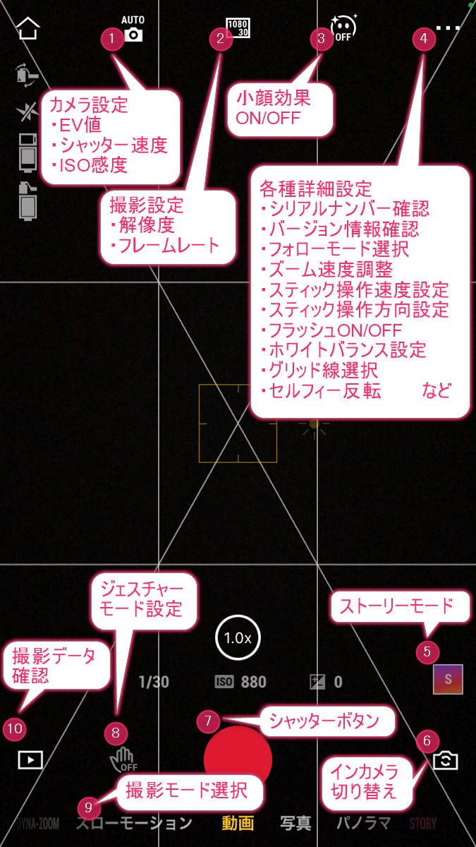 撮影画面に表示されているアイコンから操作・設定できる内容はコチラです。