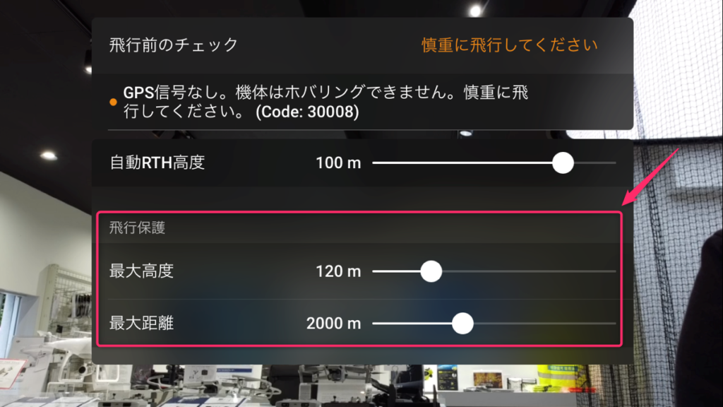 画面が切り変わり、「飛行保護」のところがジオフェンスです。