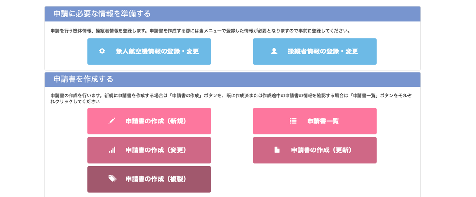 今回は「全国包括1年間」「30m未満」「目視外飛行」についての許可を得る流れをご案内する内容となりますので、これまでに Phantom 4 や Mavic 2 なんかを飛行させるための許可申請を通した経験がある方はこのまま読み進めてください。