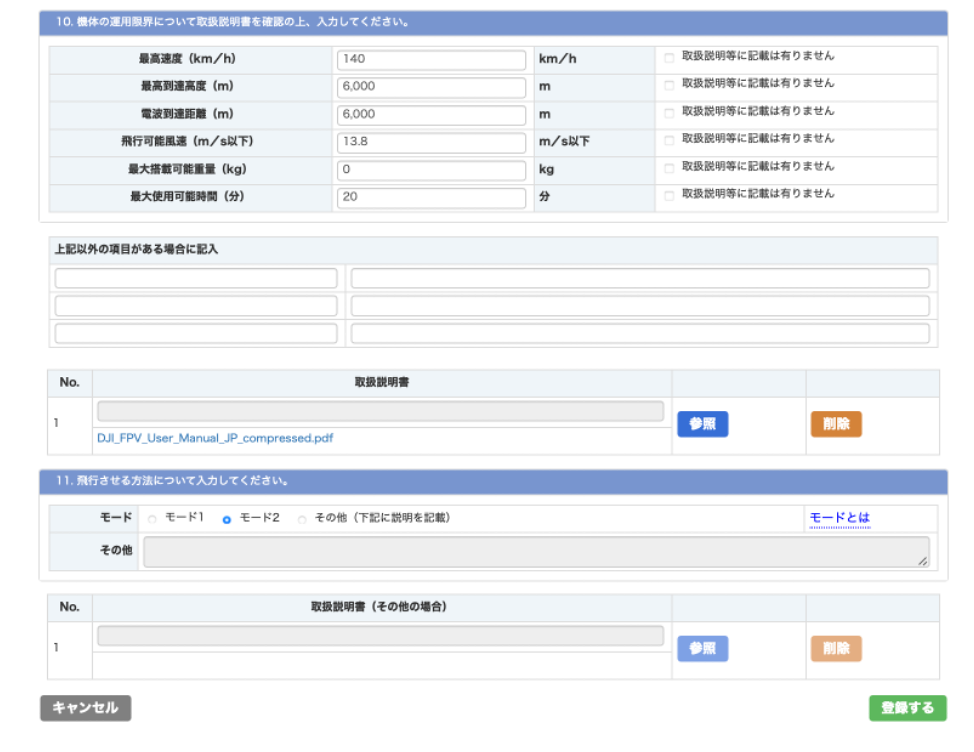 続けて「機体の運用限界」「飛行方法」を入力します。