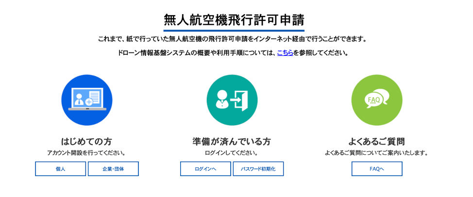 既に経験されている方にはお馴染みの、ドローン情報基盤システムより申請します。申請に際しては10時間以上の飛行経験が必要です。経験を積んだ上でアカウント作成を行ってください。