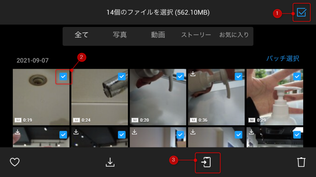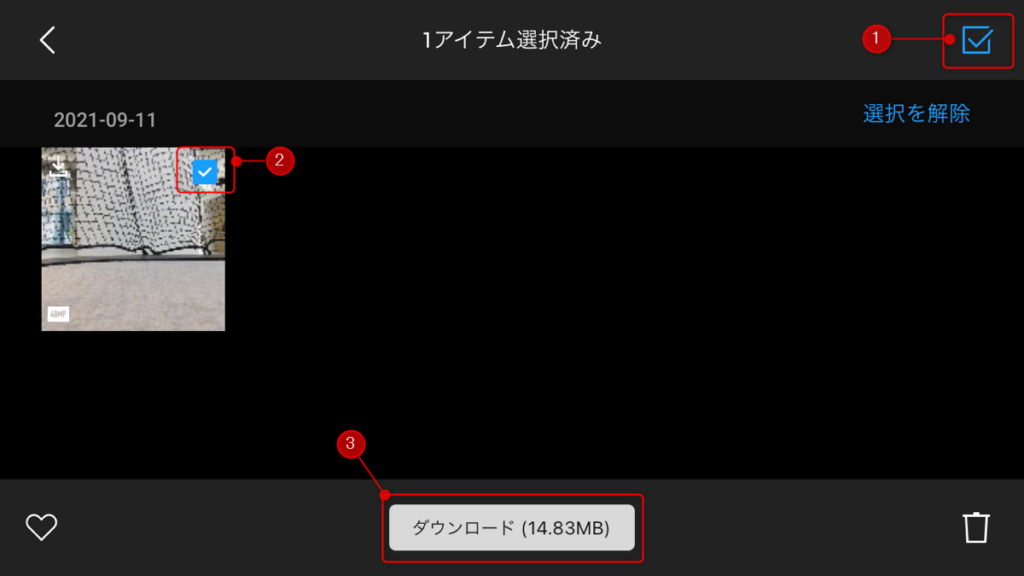 画面右上の複数選択をチェック(①)して必要な素材をタップして選択(②)、画面下部右側のダウンロードボタンをタップします。
