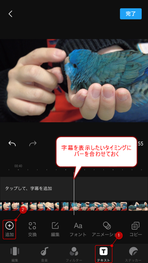 ここでは映像に出ているインコの種類を入力してみました。字幕の内容・表示場所・表示の長さを調整したら[完了]を押します。