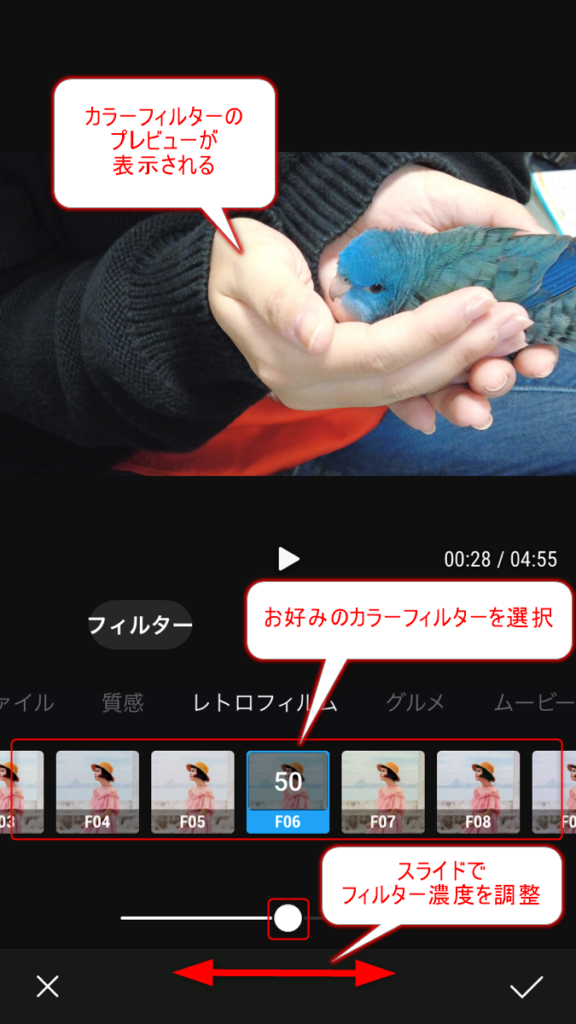 プレビューを確認しながら調整し、終わったら右下のチェックマークをタップして完了です。