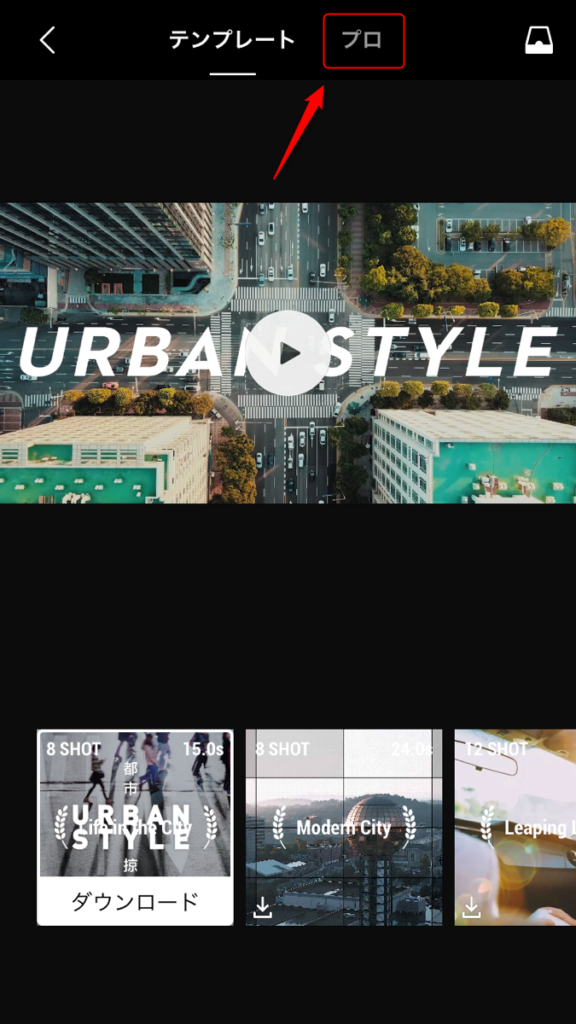 「プロ」を選びます。「テンプレート」を選ぶと、事前に用意された動画とカットを差し替える形で簡単に動画が作れますが、今回は細かい設定をしながら自分で動画編集をしていく方法をご説明します。