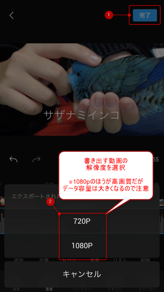 すると、エクスポート時の動画サイズの選択が出てきます。現在選べるのは 720p と 1080p です。大きな画面で見るときは 1080p、ファイルサイズを節約したいときは 720pがおすすめですよ。