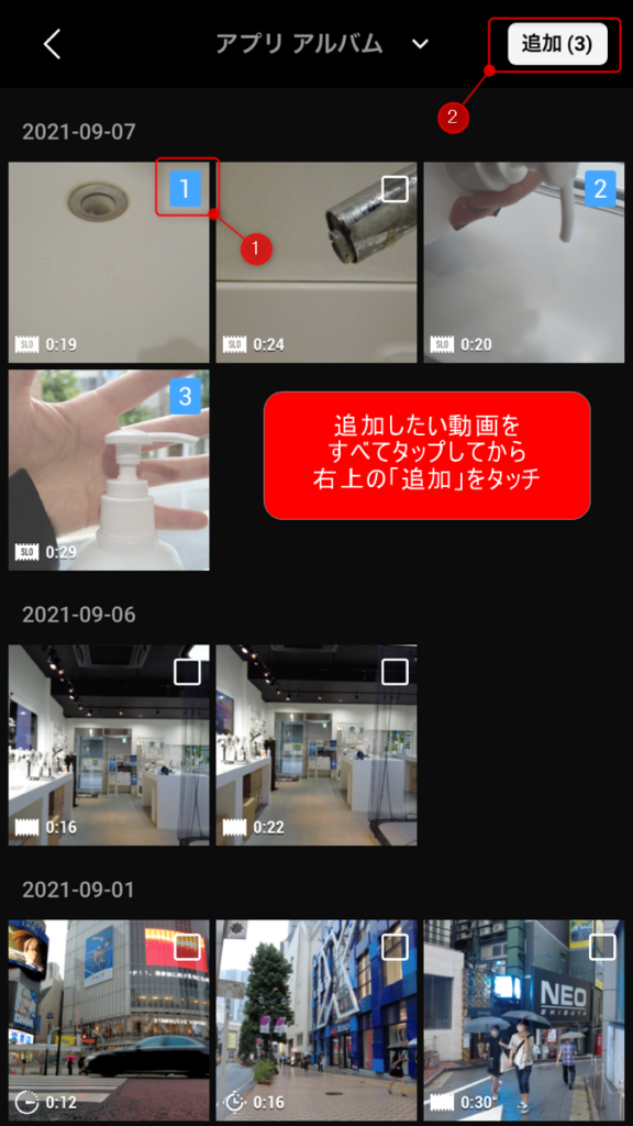 「プロ」を選ぶと、こちらの画面に切り替わります。編集で使いたいカットを選んで「追加」をタップします。