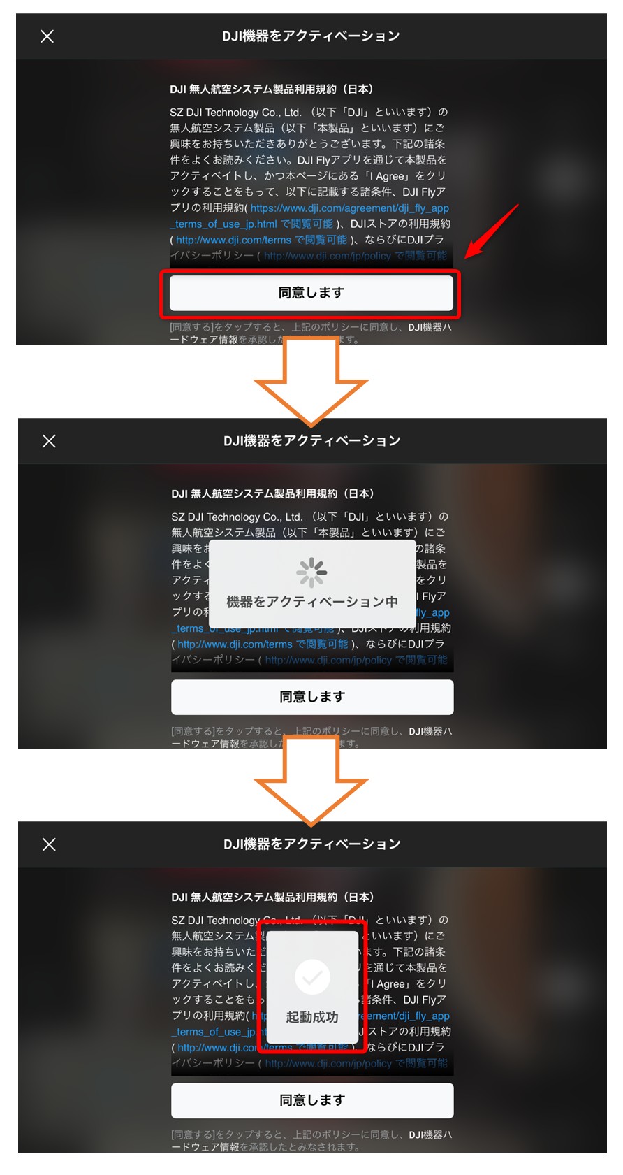 送信機にスマートフォンを接続した上で送信機とドローンの電源を入れ、DJI Fly を起動すると、自動でアクティベーション画面に移行します。表示される手順に従ってアクティベーションを行ってください。