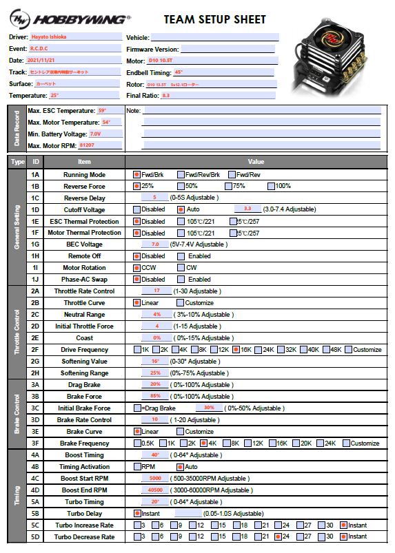 スムーズ且つ高回転まで回るセッティングで扱いやすさ重視となっていますので、ご参考にしてみてください。