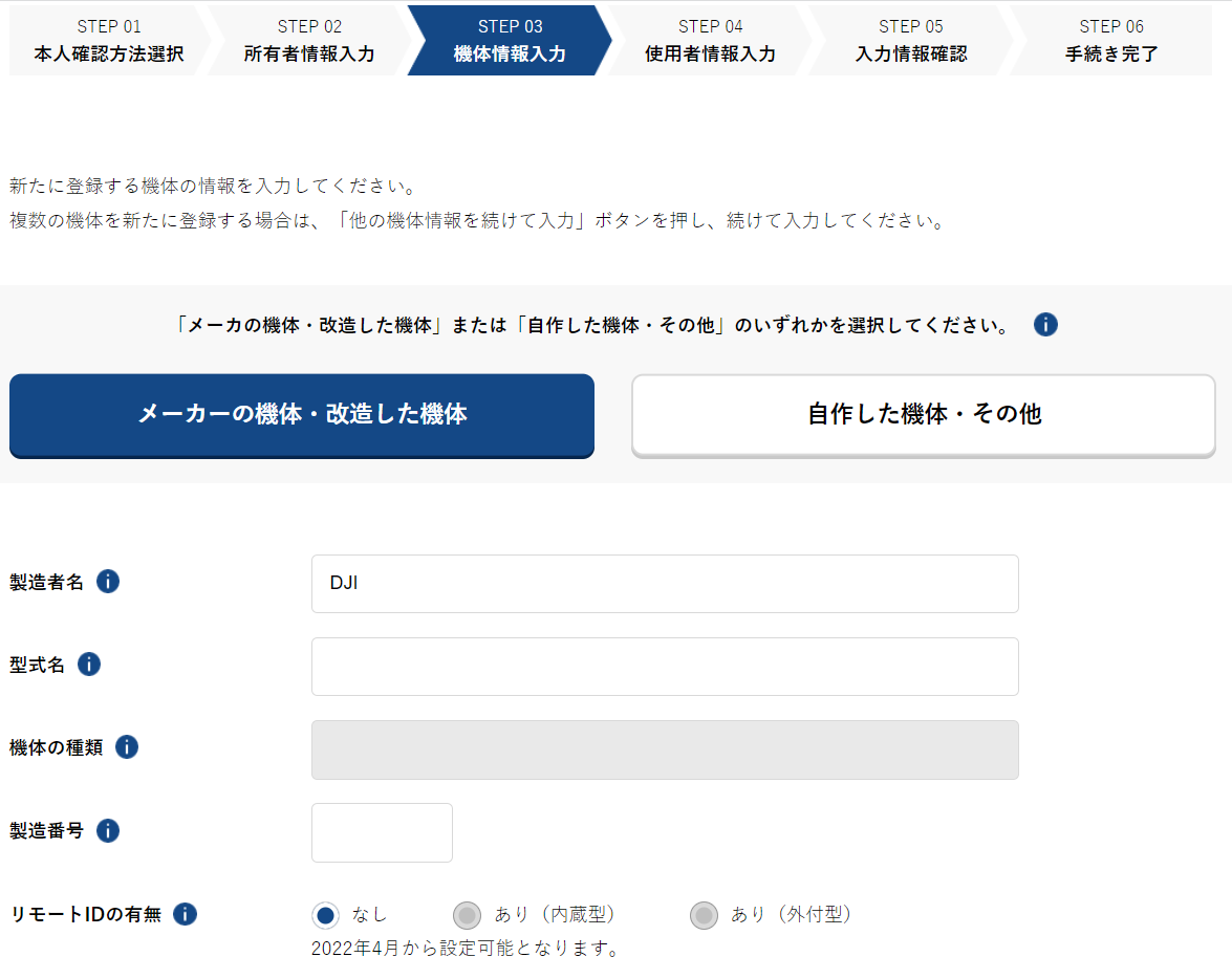 ドローン本体の情報を入力します。DJI製ドローンの場合は「メーカーの機体・改造した機体」を選び、製造者名は「DJI」を選んでください。型式名は「Mavic 3」などの機体の種類を入力します。製造番号はシリアルナンバーのことです。バッテリーソケットや機体の化粧箱バーコード付近に記載がありますので、確認して入力してください。